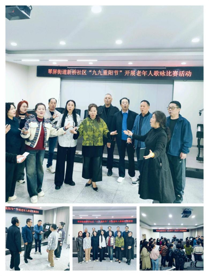 为展现辖区老年人老有所乐、老有所为的精神风貌,新桥社区举办了“九九重阳节歌咏比赛”。活动以“银龄金曲”为主题,吸引了众多热爱歌唱的老年朋友踊跃报名。比赛现场气氛热烈,掌声不断。参赛者们精神矍铄,盛装登场。他们或独唱,或小合唱,或采用传统的戏曲唱腔,深情演绎了《歌唱祖国》《我的祖国》《最美不过夕阳红》等一系列经典红歌。嘹亮的歌声唱出了对党、对祖国的无限热爱与深情祝福,表达了对今天幸福生活的赞美与珍惜。舞台上的他们,神采飞扬,仿佛重回青春岁月,充分展示了新时代老年人积极乐观、健康向上的生活态度和丰厚的文化底蕴。