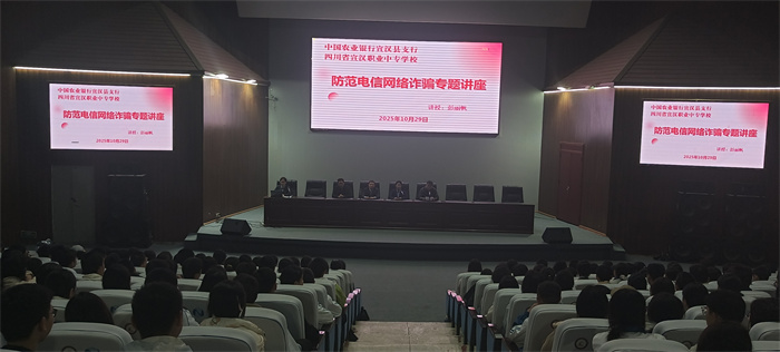 “别以为你还是孩子,骗子就不会盯上你!”当这行警示语在宣汉职专学术报告厅大屏幕上亮起,一场围绕电信网络诈骗的“青春防卫战”正式打响。10月29日,宣汉职专与中国农业银行宣汉县支行联合举办防范电信网络诈骗专题讲座,以生动形式、扎实内容,为农业管理专业部师生带来一堂反诈“必修课”。